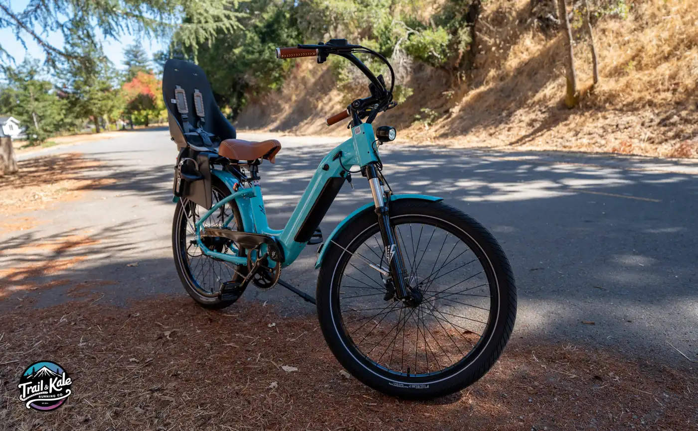 When it came to the Model R specifically, a few features appealed to me; the front suspension, capability to include a child seat, and it stylish cruiser design. The 26-inch diameter (with 3" width) Rhino tires and the suspension fork make navigating everything from smooth pavement to bumpy trails feel that much smoother and stable for me and Sebastian. On our way to daycare, I’m dealing with different surfaces, and I like that the Model R handles them all well.
