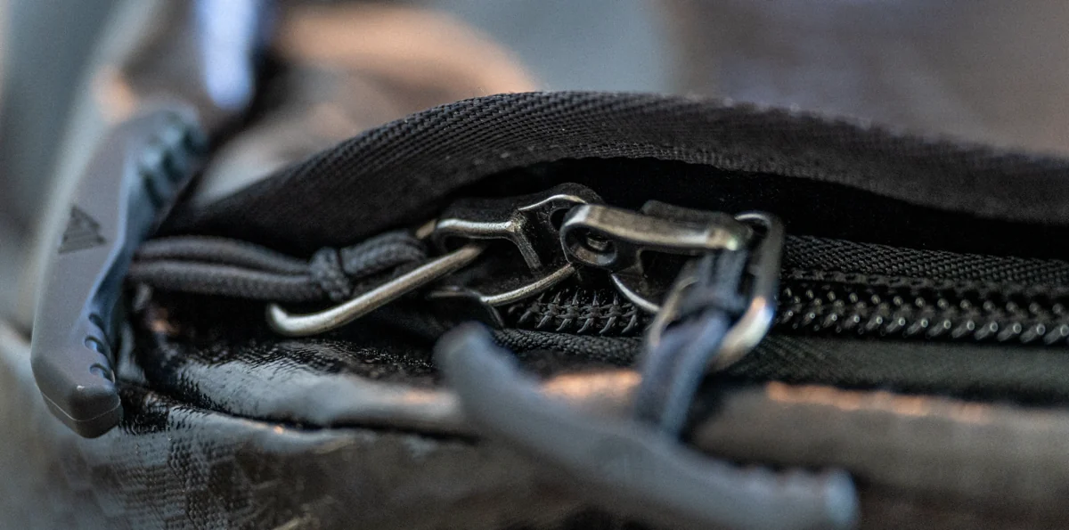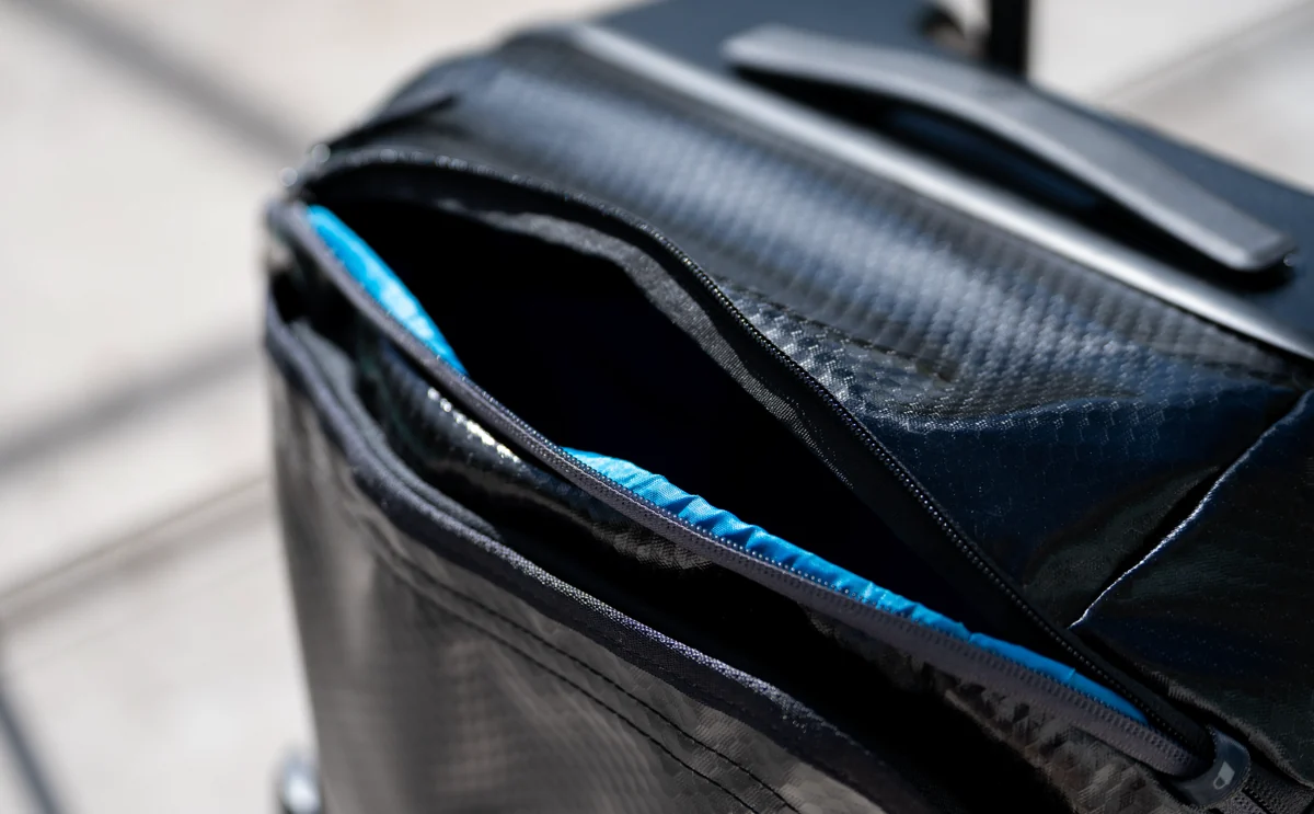 - Main material is 900D TPU-coated polyester ripstop (40% recycled). Zippers are #10 lockable YKK with oversized T-Grip pullers (Lock compatibility: Zippers accept luggage locks (not included))