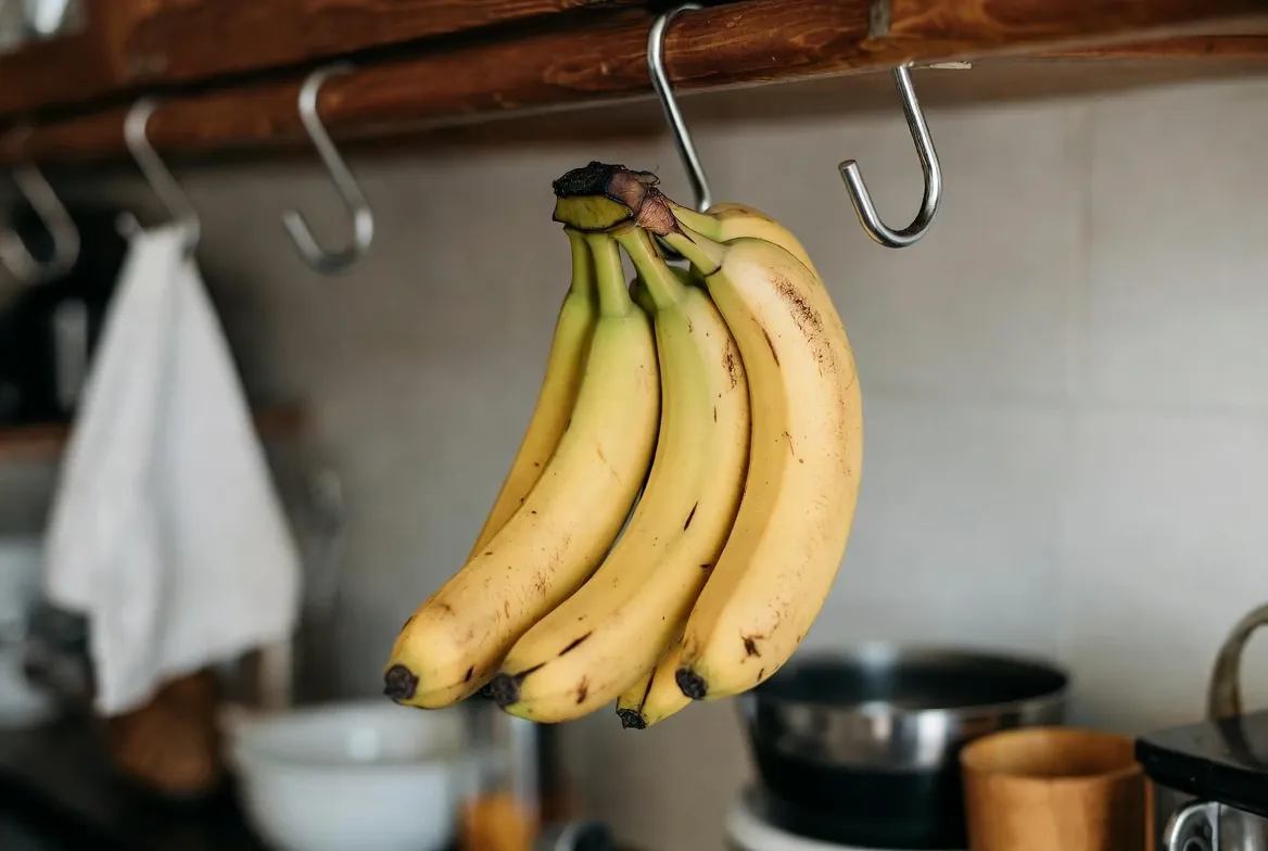 Banana hangers aren't just a kitchen novelty. Resting bananas on a hard surface traps moisture underneath and accelerates bruising, which itself speeds breakdown. Hanging allows airflow around the whole fruit.