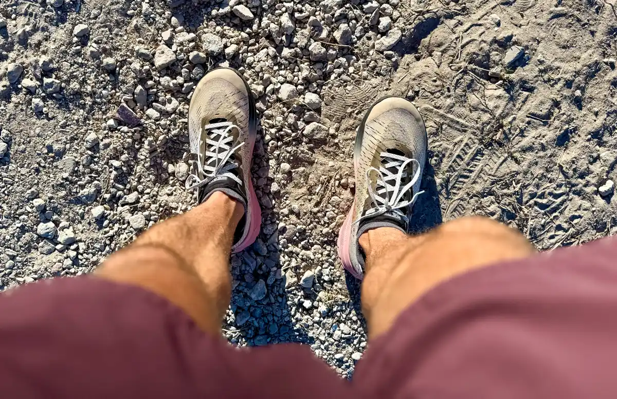The platform is wide, the heel is structured, and the ride feels well planted, especially on gravel and mixed surfaces.