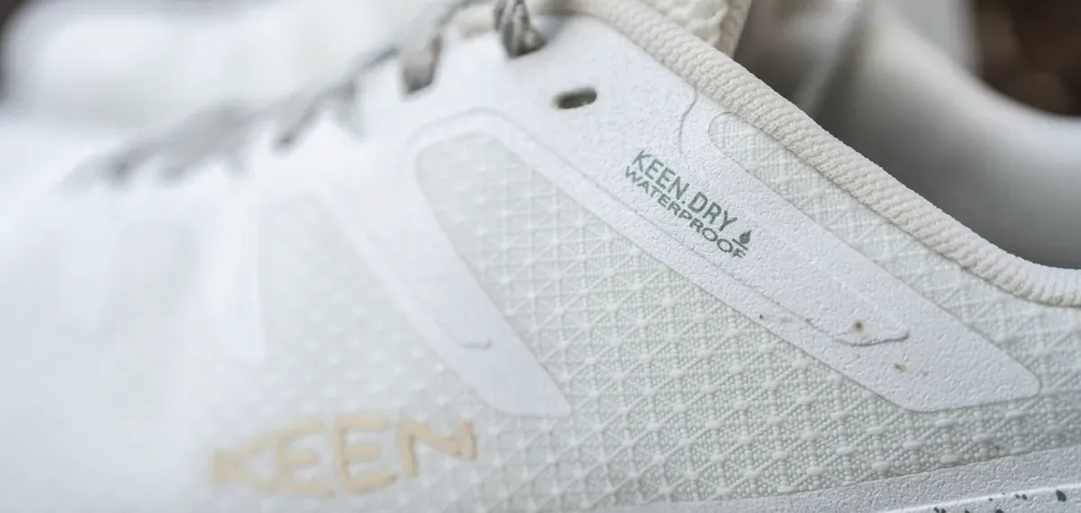 - Upper: Flexible performance mesh with TPU overlays, protective toe bumper, molded heel counter. Waterproofing uses KEEN.DRY waterproof breathable membrane with PFAS-free DWR finish