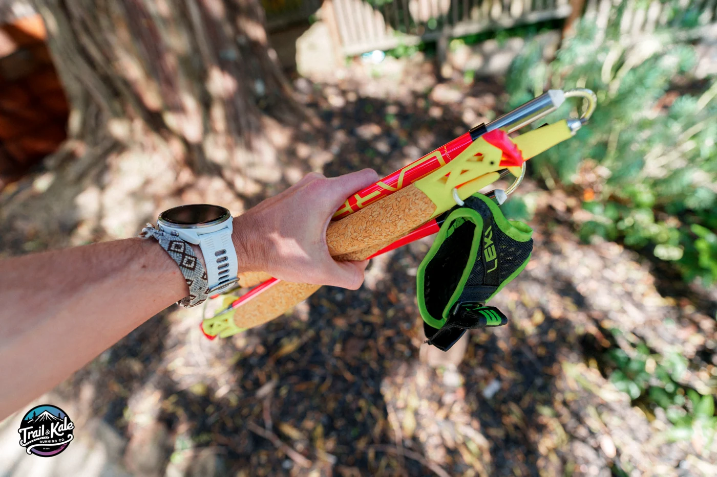 They feature LEKI's shark grip system made of cork, which give them a nice ergonomic and comfortable grip. This is particularly beneficial for trail runners who need to use the poles aggressively to power up steep inclines - that includes runners who enjoy really going for it during a race - myself included. The cork material helps in maintaining a firm hold even under intense pressure.