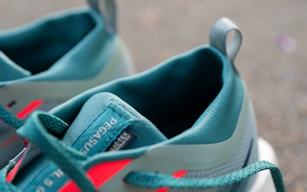 The Pegasus Trail 5 GTX fits true to size, fits securely and has a medium width overall. The Gore-Tex Invisible Fit upper flexes very really well which is a rarity in most waterproof trail running shoes, without adding excess bulk, and the built-in gaiter around the collar adds a secure, locked-in feel while keeping out trail debris.