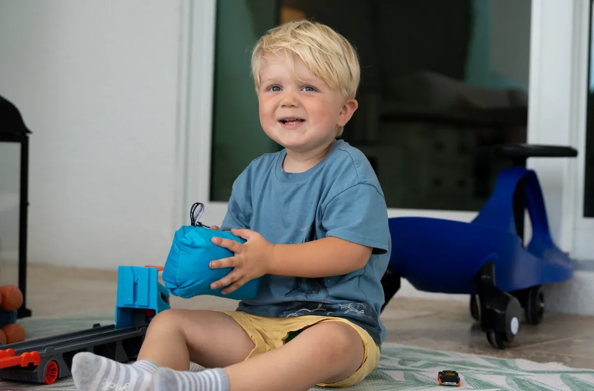 When you want the jacket back, you pull it out of the pocket and shake it and it puffs up again. Like magic. I tried to put a Hot Wheels Car in there too, when the jacket was inside, but Daddy said no, and it wouldnt fit anyway, too snug.