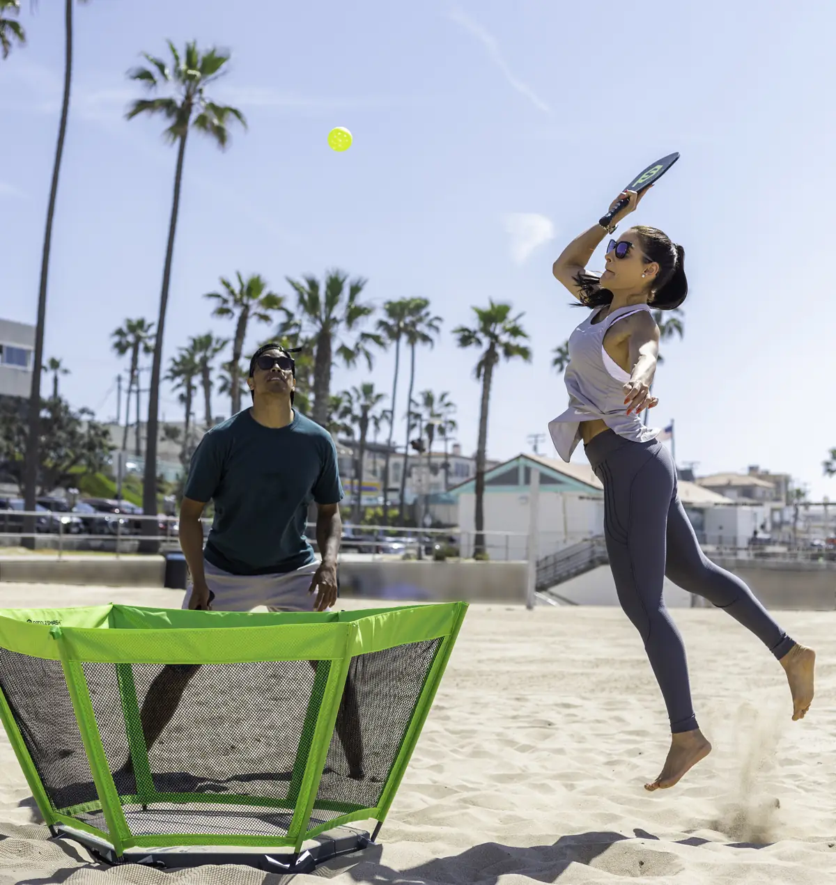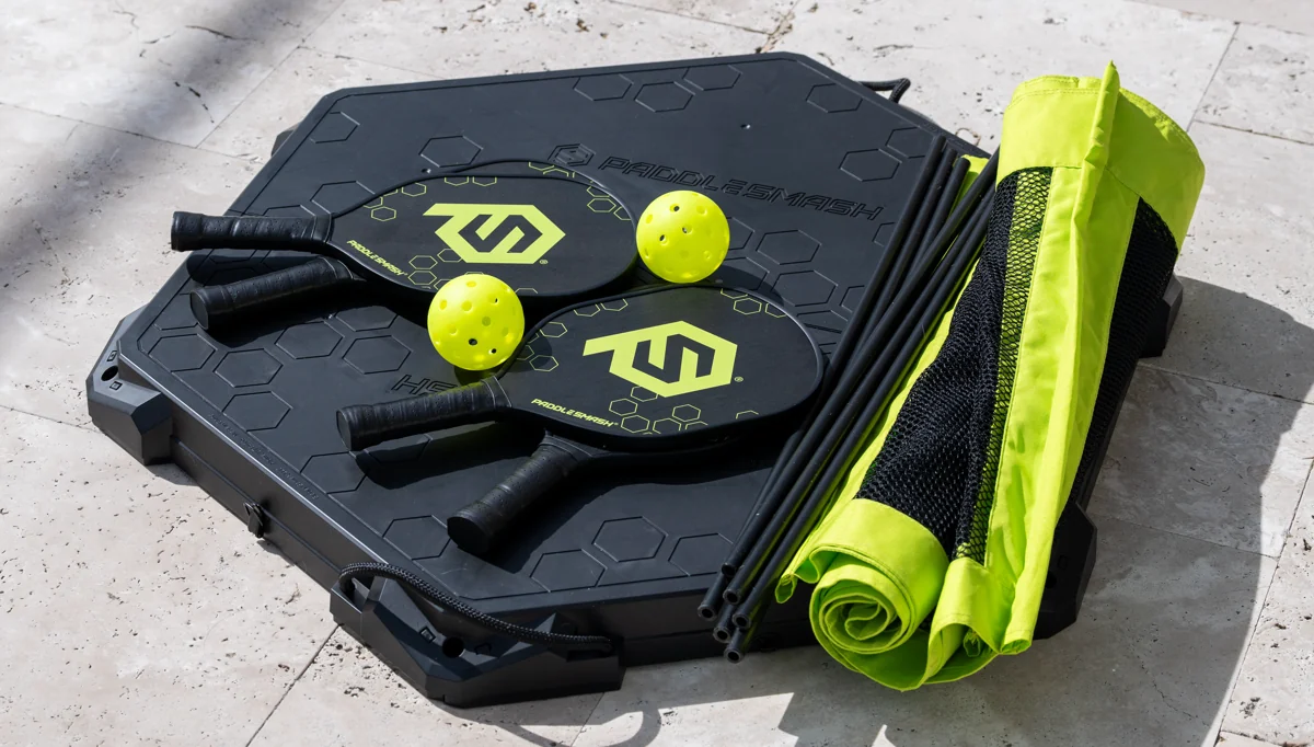 Imagine if pickleball and Spikeball had a baby: the paddles, rallies, and satisfying “smack” of one mixed with the compact teamwork and bounce of the other.