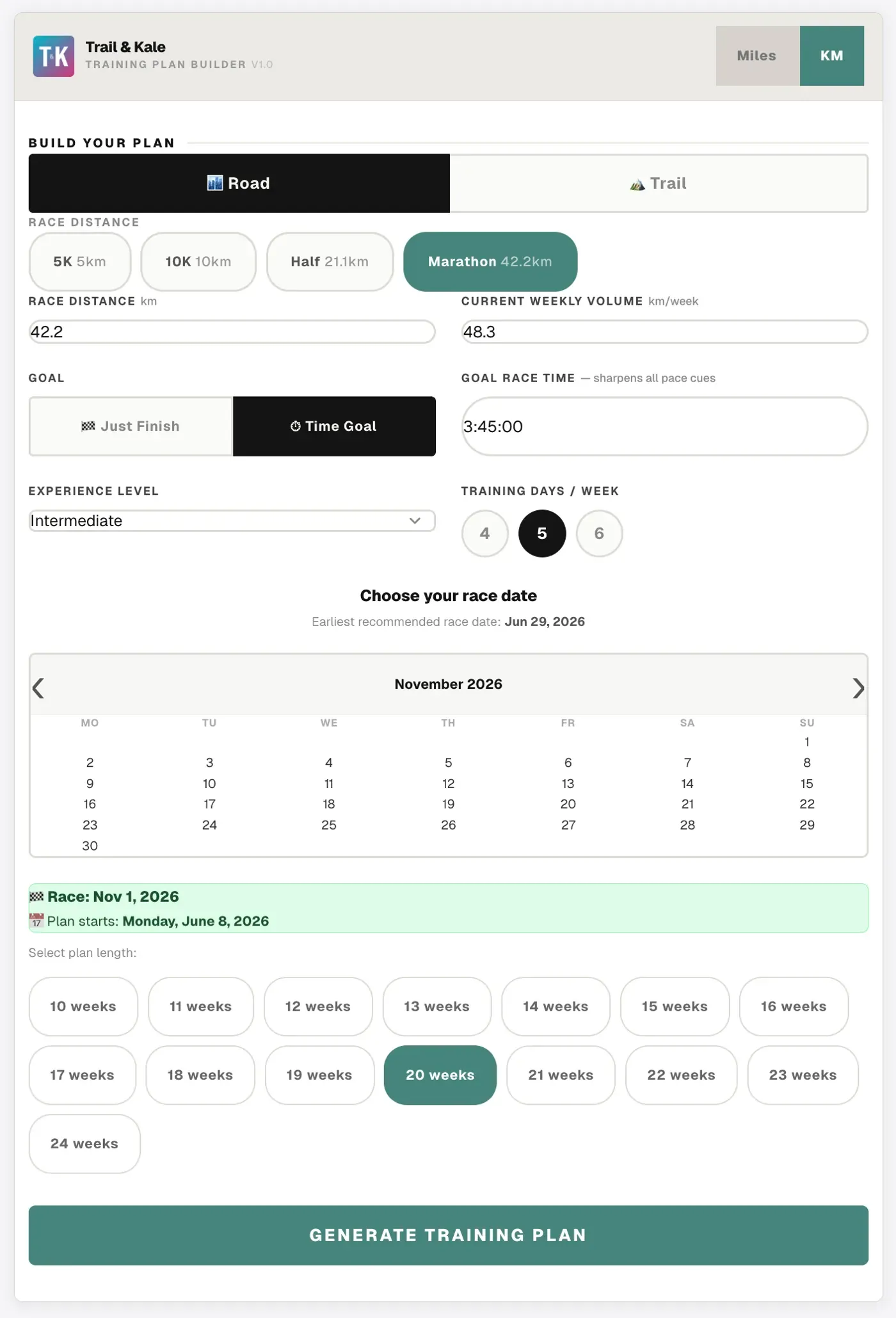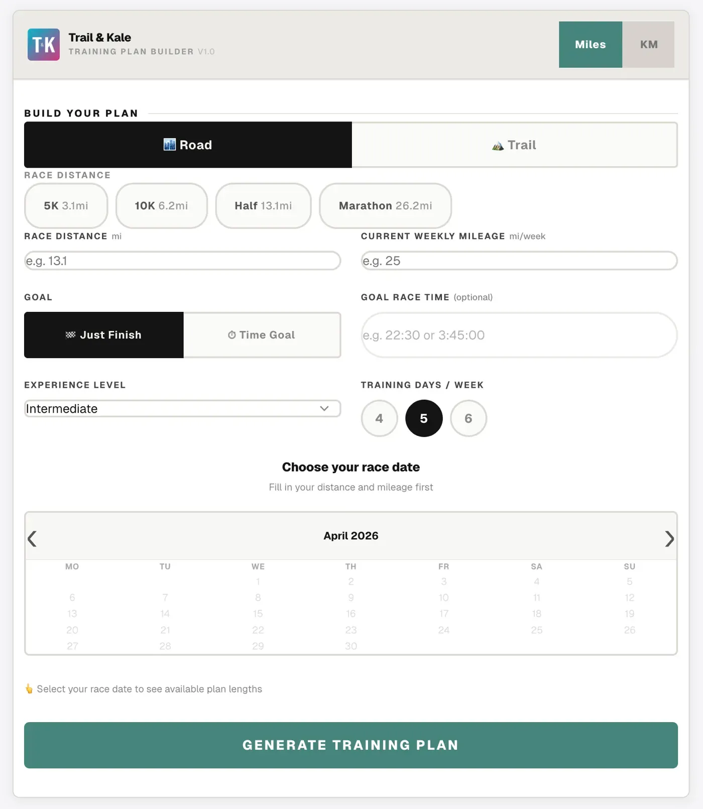 Fill in your current weekly mileage and select your experience level. Choose how many days per week you want to train: 4, 5, or 6.