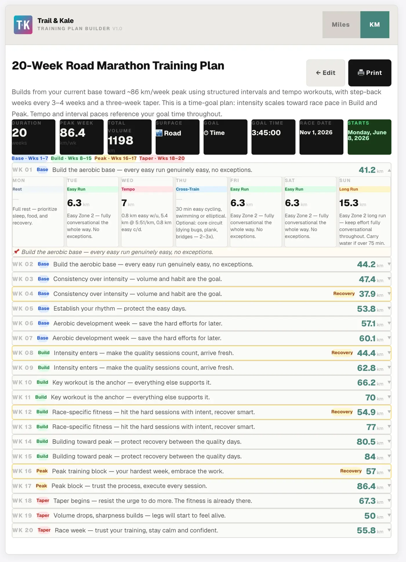 Step-back recovery weeks are built in automatically every 3–4 weeks, cutting volume by around 25% to allow adaptation before the next build. The generator handles all of this automatically — you don't need to think about it.