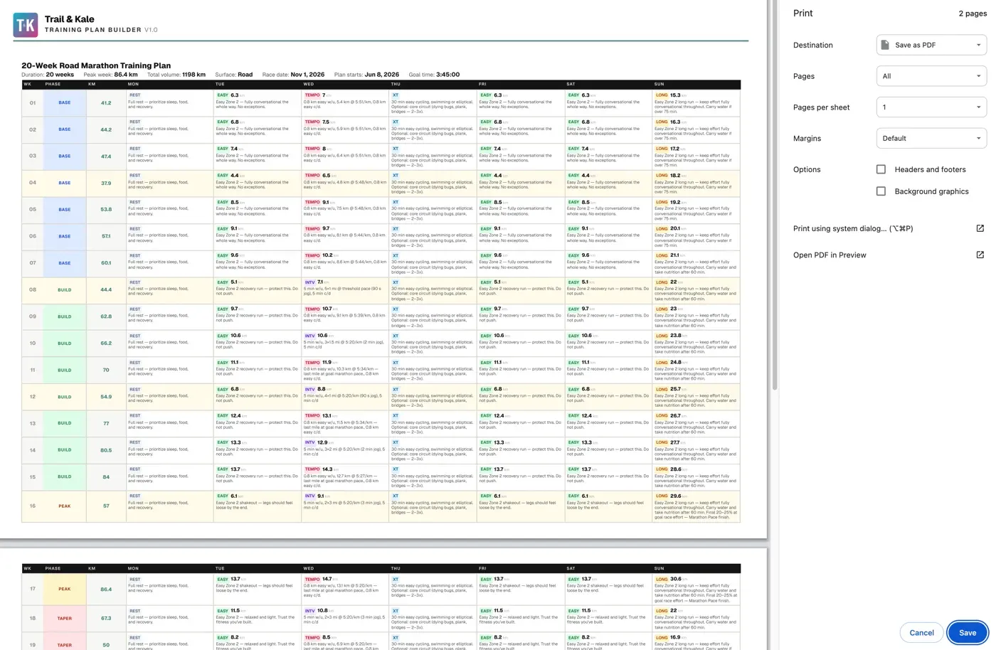 Our running training plan generator builds your plan from scratch. Enter your race date, your current weekly mileage, your experience level, and your goal. Your complete week-by-week training schedule is ready in seconds, covers every session from Monday to Sunday, and prints beautifully on a single page (or two if need be).