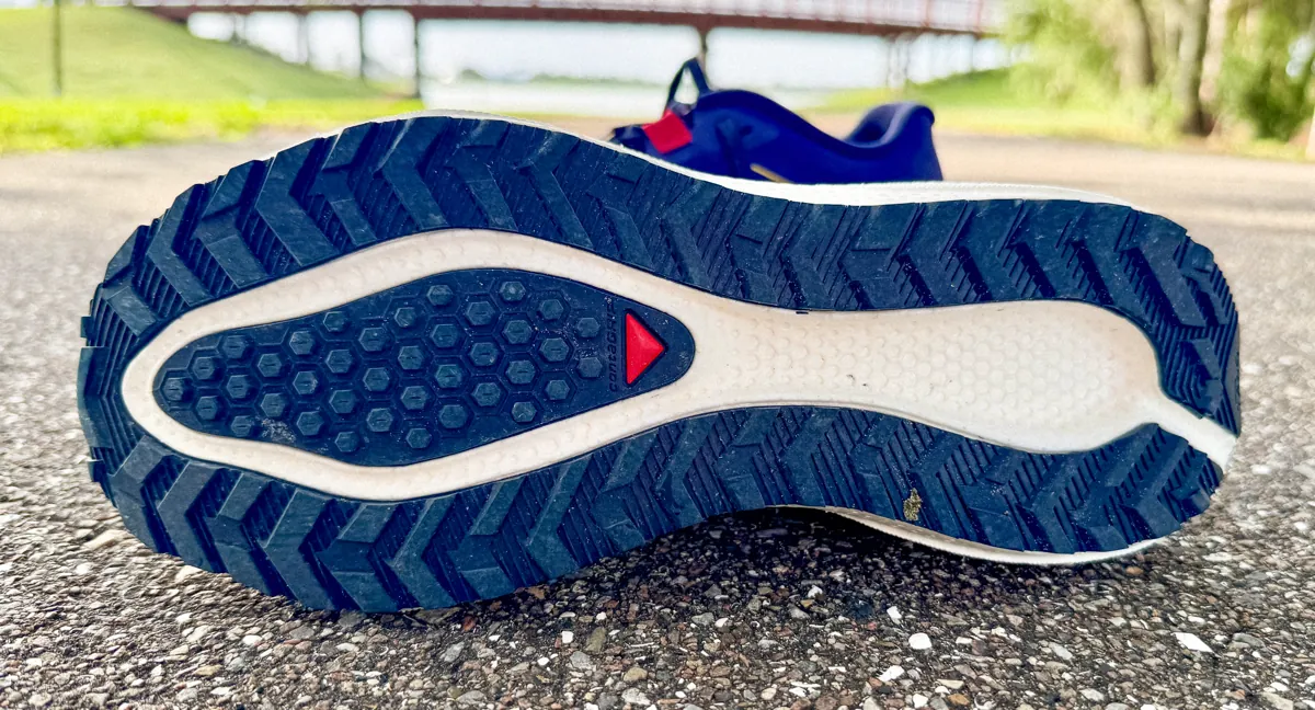 The chevron-lugged Gravel ContaGRIP outsole offers much better traction on dirt, crushed gravel, and wet pavement.