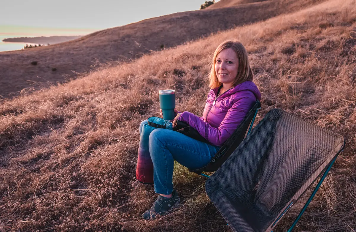 Our chair of choice is the Helinox Chair Zero, a light, comfortable, four-legged camp chair that packs down to the width of a standard 32 oz. water bottle and weighs a single pound.