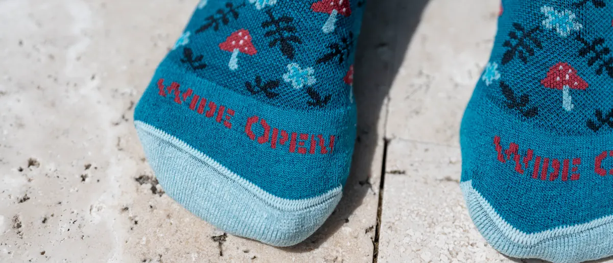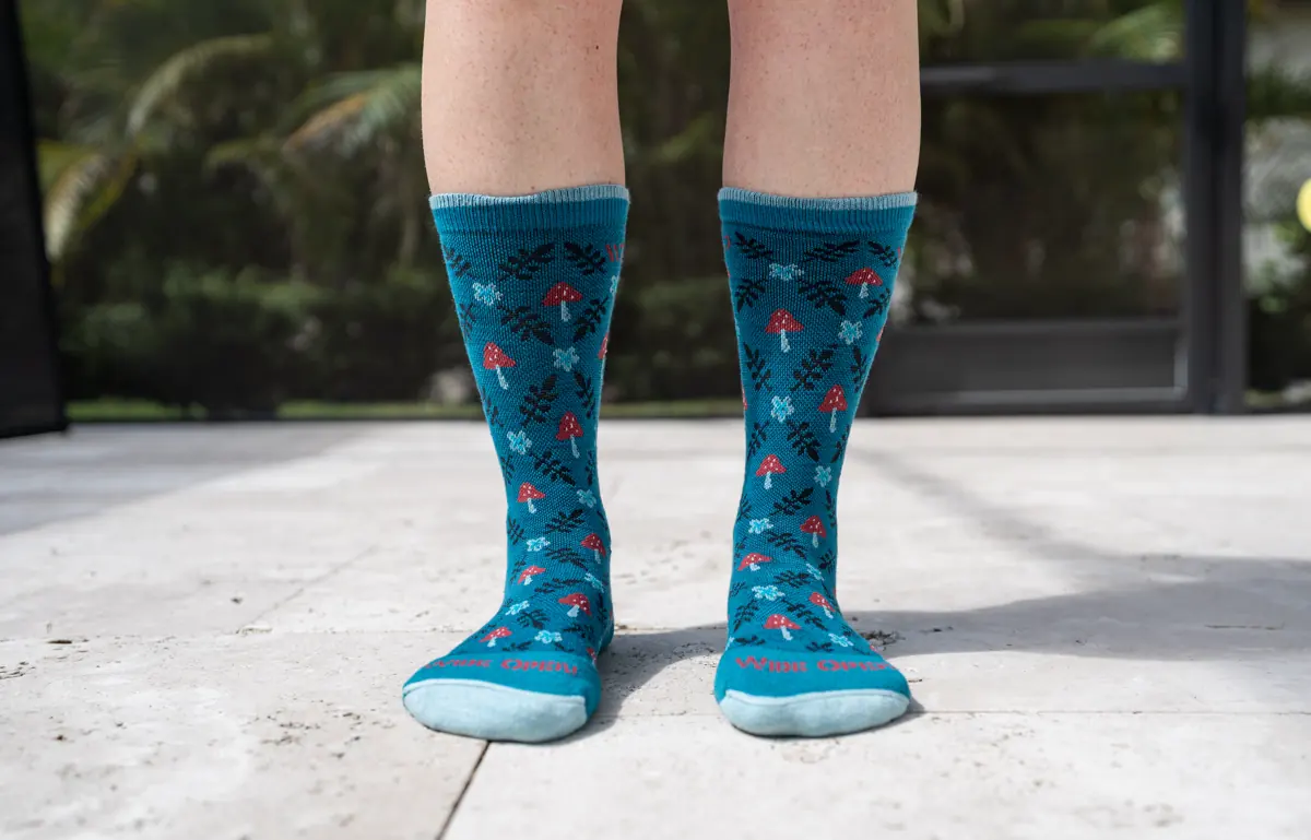 I’ve been testing several pairs from Wide Open, but the Women’s Wildwood Cushioned Crew Socks in Teal have become my go-to favorites.