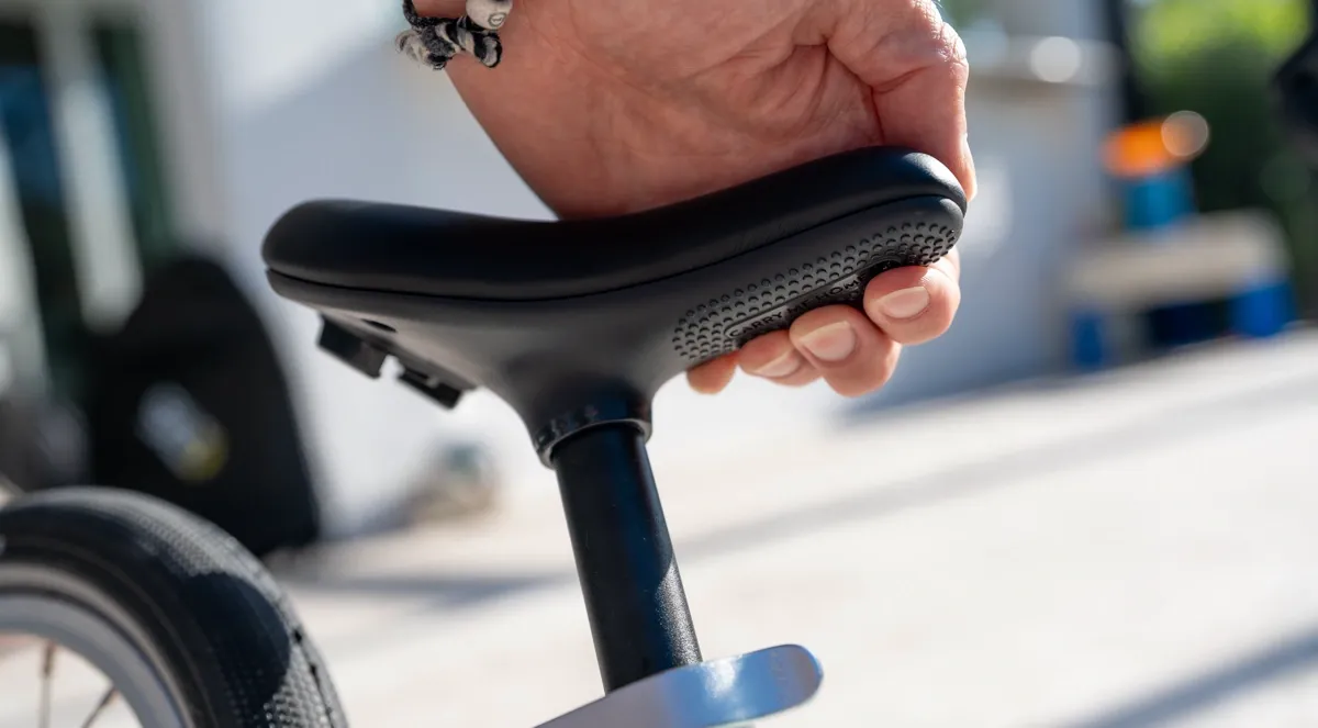 The saddle doubles as a carry handle — which my parents use constantly, because I have a talent for deciding I am done riding at the exact moment we are furthest from home.